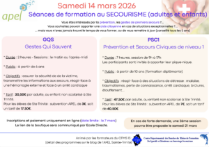 L’APEL organise dans l’établissement des séances de formation au secourisme le samedi 14 mars, pour les élèves et les familles qui le souhaitent. Deux formations sont proposées. Durée, public, objectifs et tarifs sont précisés ci-dessous, et les programmes sont téléchargeables ici : prog GQS et prog PSC1.