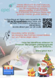 Pour offrir à votre entourage des cadeaux originaux et uniques, tout en aidant au financement des projets pédagogiques des enseignantes, l’APEL vous propose de découvrir les articles personnalisés avec le dessin de vos enfants sur la boutique en ligne « dessindecole » (T-shirts, calendriers, gourdes, mugs, porte-clés, trousses, sacs, magnets…) . Une nouveauté cette année : les dessins des fratries rassemblés sur un même support.
